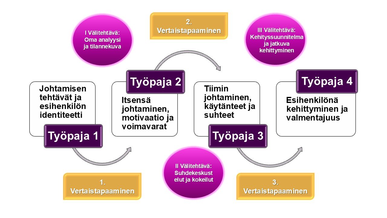 Ohjelma koostuu neljästä kolmen tunnin työpajasta, joita täydentävät kolme vertaisryhmissä toteutettavaa tehtävää sekä henkilökohtaiseen pohdintaan perustuvat välitehtävät työpajojen välillä. Vertaisryhmätyöskentely ja pohdintatehtävät syventävät oppimista ja auttavat soveltamaan opittuja teemoja suoraan omaan esihenkilötyöhön. Koulutuskokonaisuus keskittyy vahvasti opetuksen teemojen viemiseen käytäntöön ja oman kehityssuunnitelman toteuttamiseen.